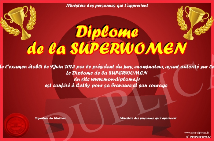 Envoyez par email votre Diplôme de la SUPERWOMEN personalisé