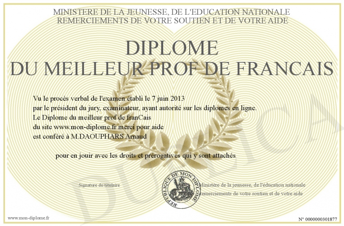 Envoyez par email votre Diplôme du meilleur prof de franCais personalisé