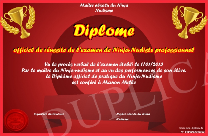 Envoyez par email votre Diplôme officiel de réussite de l'examen de Ninja-Nudiste professionnel personalisé