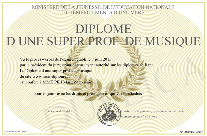 Envoyez par email votre Diplôme d une super prof de musique personalisé