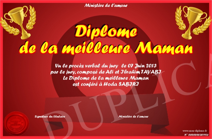 Envoyez par email votre Diplome de la meilleure Maman personalisé