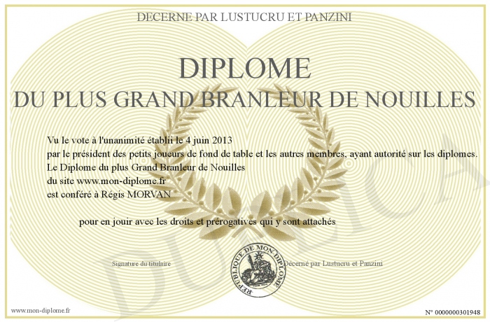 Envoyez par email votre Diplome du plus Grand Branleur de Nouilles personalisé