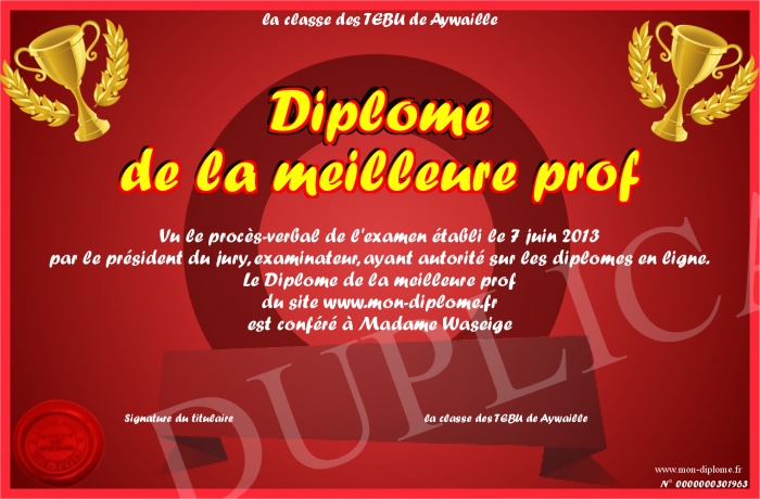 Envoyez par email votre Diplôme de la meilleure prof personalisé