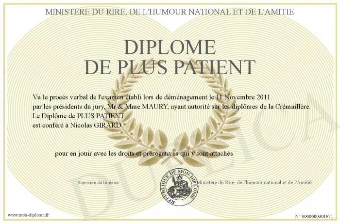 Envoyez par email votre Diplôme de PLUS PATIENT personalisé