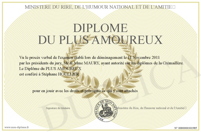 Envoyez par email votre Diplôme du PLUS AMOUREUX personalisé