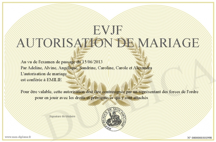 Envoyez par email votre Evjf AUTORISATION DE MARIAGE personalisé