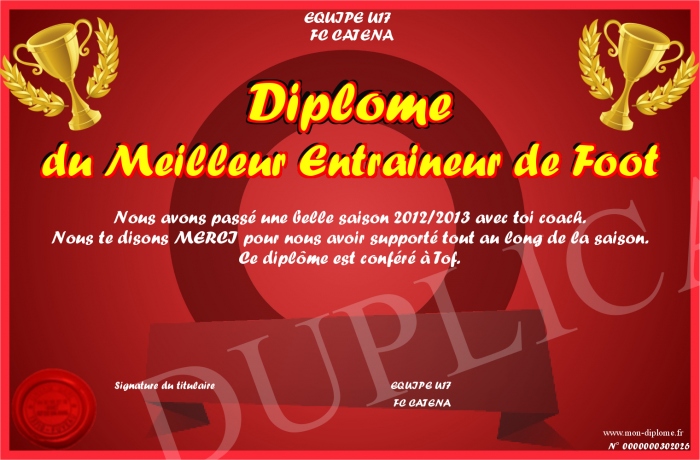 Envoyez par email votre Diplôme du Meilleur Entraineur de Foot personalisé