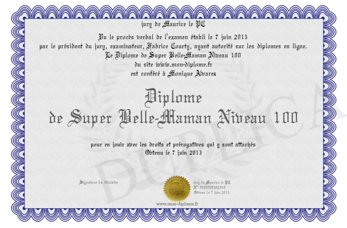 Envoyez par email votre Diplôme de Super Belle-Maman Niveau 100 personalisé