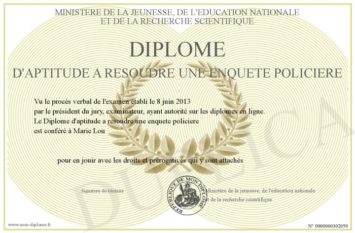 Envoyez par email votre Diplôme d'aptitude a resoudre une enquete policiere personalisé