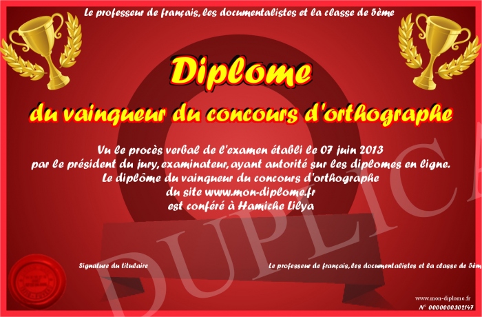 Envoyez par email votre Diplôme du vainqueur du concours d'orthographe personalisé