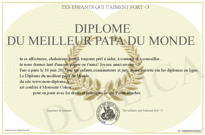 Envoyez par email votre Diplôme du meilleur papa du Monde personalisé