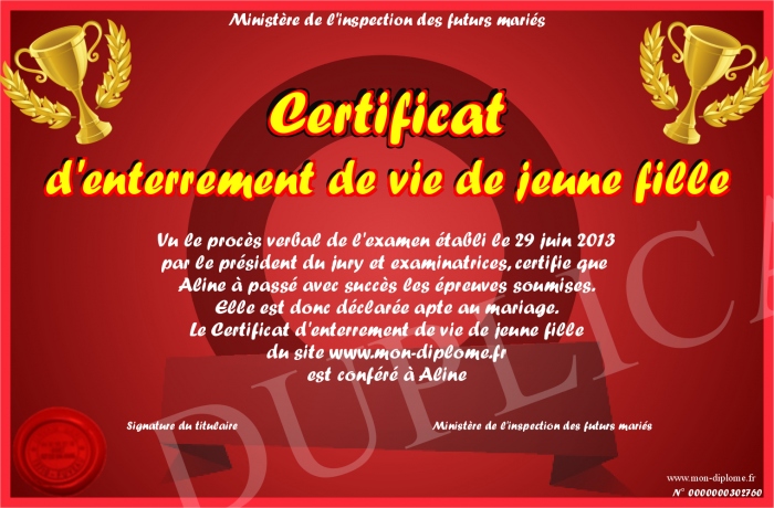 Envoyez par email votre Certificat d'enterrement de vie de jeune fille personalisé