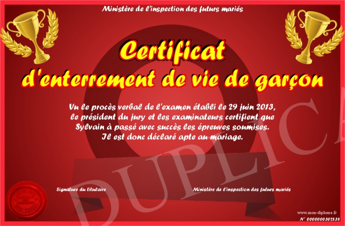Envoyez par email votre Certificat d'enterrement de vie de garçon personalisé