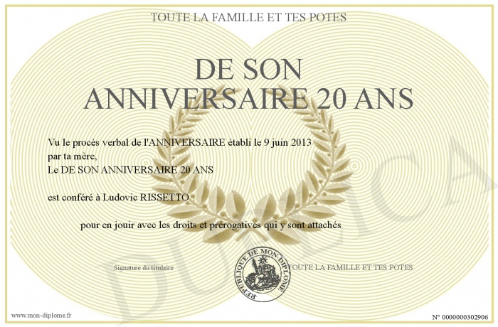 Envoyez par email votre DE SON ANNIVERSAIRE 20 ANS personalisé