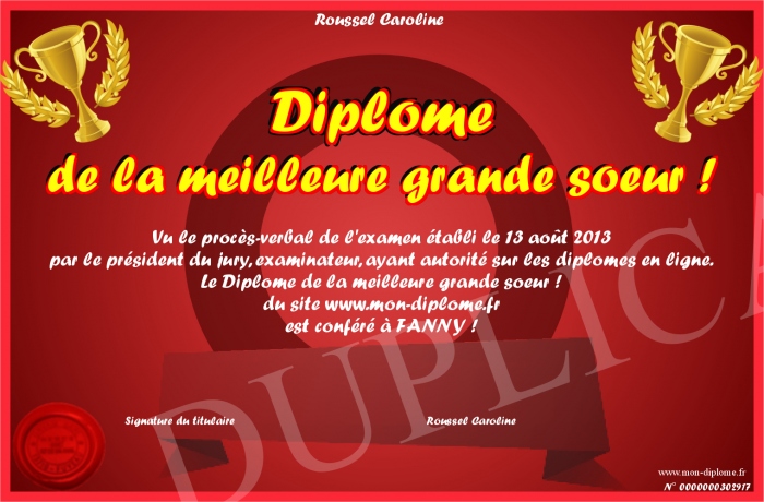 Envoyez par email votre Diplôme de la meilleure grande soeur ! personalisé