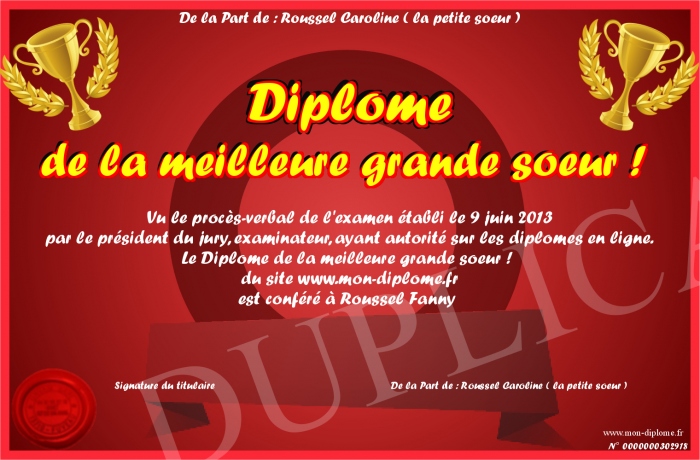 Envoyez par email votre Diplome de la meilleure grande soeur ! personalisé
