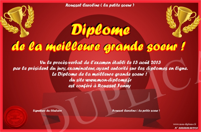 Envoyez par email votre Diplôme de la meilleure grande soeur ! personalisé