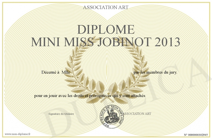 Envoyez par email votre Diplôme MINI MISS JOBINOT 2013 personalisé