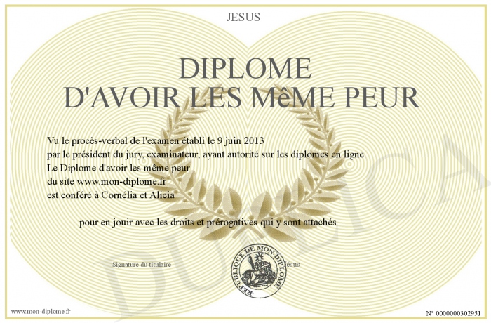 Envoyez par email votre Diplôme d'avoir les même peur personalisé