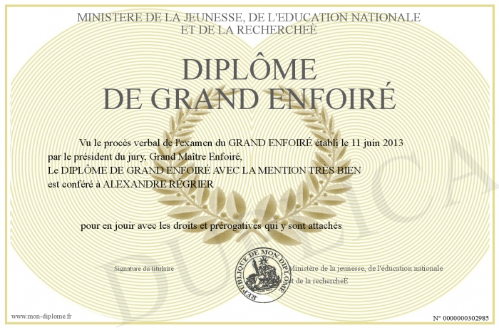Envoyez par email votre DIPLÔME DE GRAND ENFOIRÉ personalisé