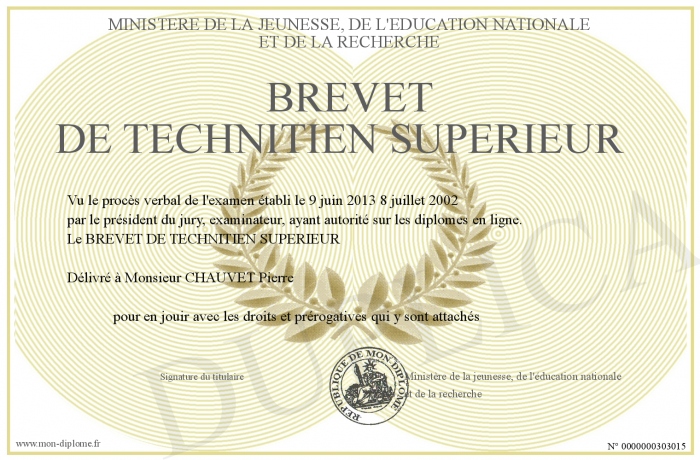 Envoyez par email votre BREVET DE TECHNITIEN SUPERIEUR personalisé