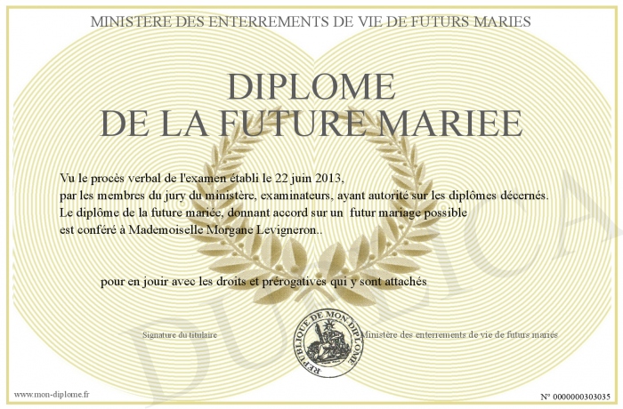 Envoyez par email votre Diplôme de la future mariée personalisé