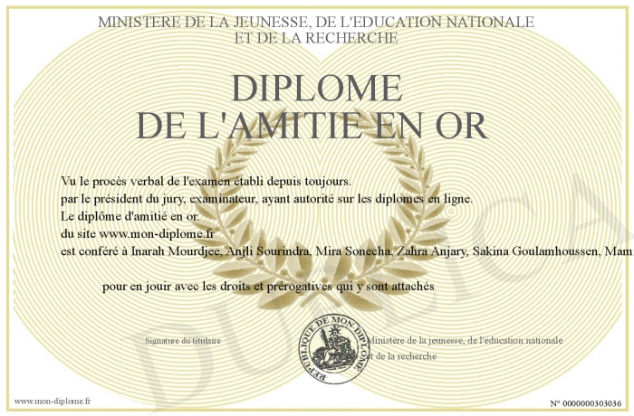 Envoyez par email votre Diplôme de l'amitié en or personalisé
