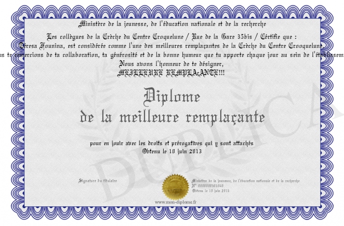 Envoyez par email votre Diplôme de la meilleure remplaçante personalisé