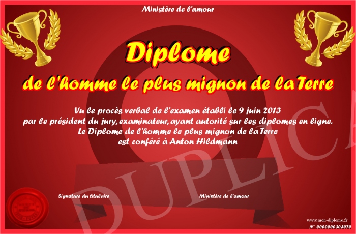 Envoyez par email votre Diplome de l'homme le plus mignon de la Terre personalisé