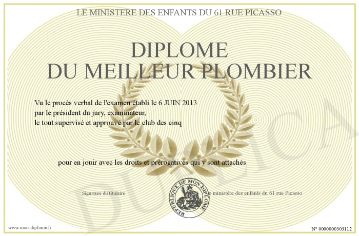 Envoyez par email votre Diplôme du meilleur plombier personalisé