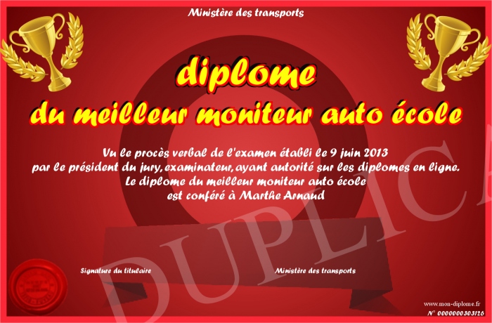 Envoyez par email votre diplome du meilleur moniteur auto école personalisé