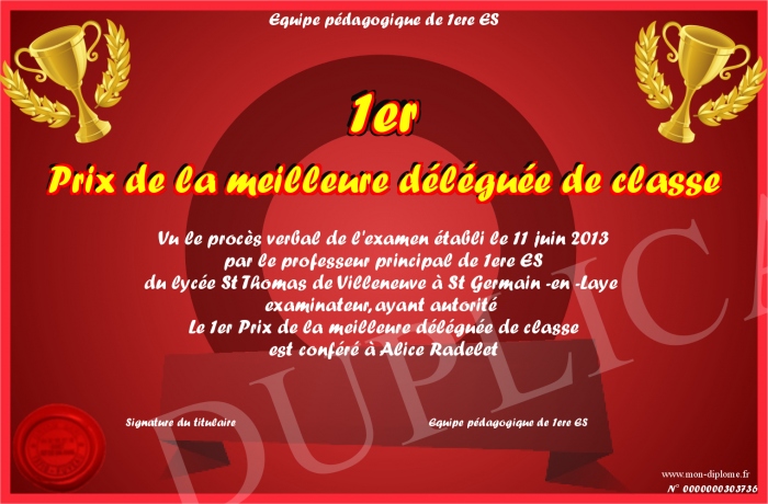 Envoyez par email votre 1er Prix de la meilleure déléguée de classe personalisé