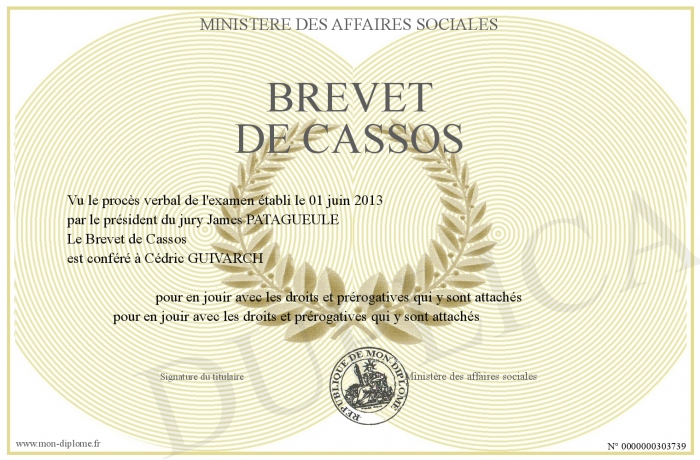 Envoyez par email votre BREVET DE CASSOS personalisé