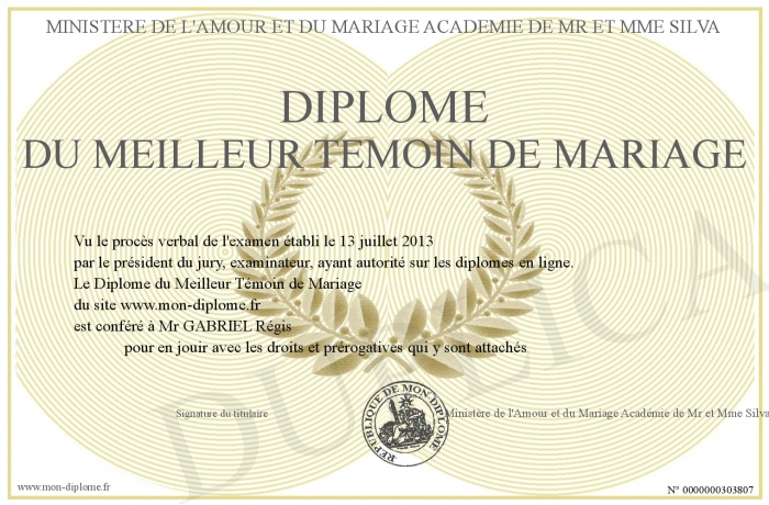 Envoyez par email votre Diplôme du Meilleur Témoin de Mariage personalisé