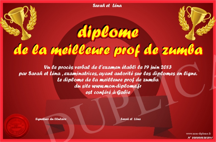Envoyez par email votre diplome de la meilleure prof de zumba personalisé