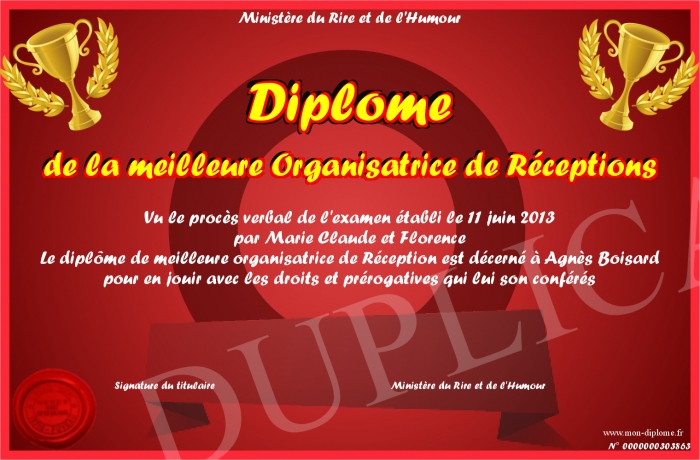 Envoyez par email votre Diplôme de la meilleure Organisatrice de Réceptions personalisé