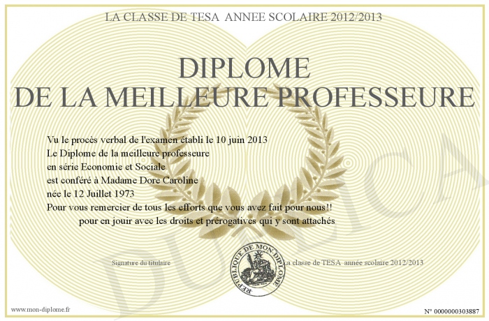 Envoyez par email votre Diplôme de la meilleure professeure personalisé