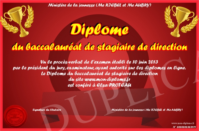 Envoyez par email votre Diplôme du baccalauréat de stagiaire de direction personalisé