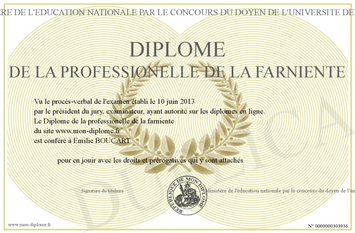 Envoyez par email votre Diplôme de la professionelle de la farniente personalisé