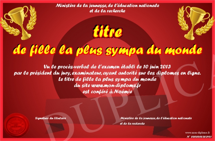 Envoyez par email votre titre de fille la plus sympa du monde personalisé