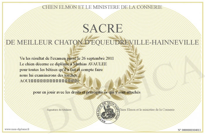 Envoyez par email votre Sacre de meilleur chaton d'Equeudreville-Hainneville personalisé