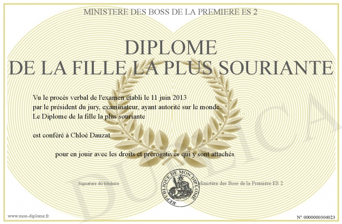Envoyez par email votre Diplôme de la fille la plus souriante personalisé