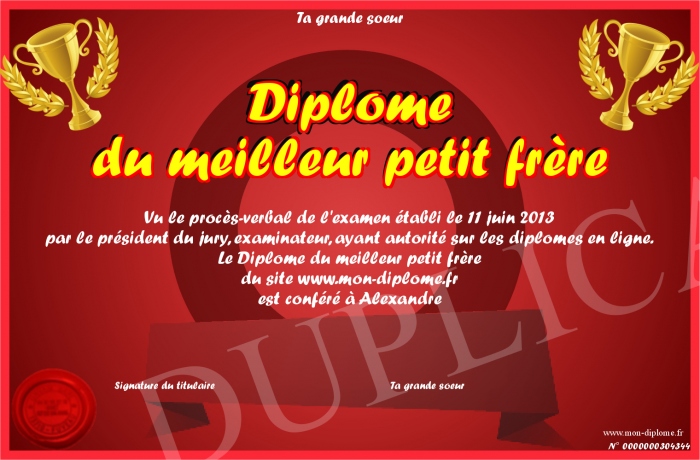 Envoyez par email votre Diplome du meilleur petit frère personalisé