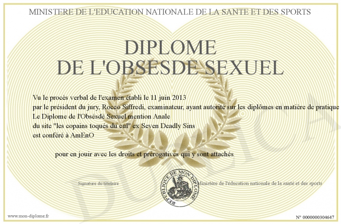 Envoyez par email votre Diplôme de l'Obsésdé Sexuel personalisé