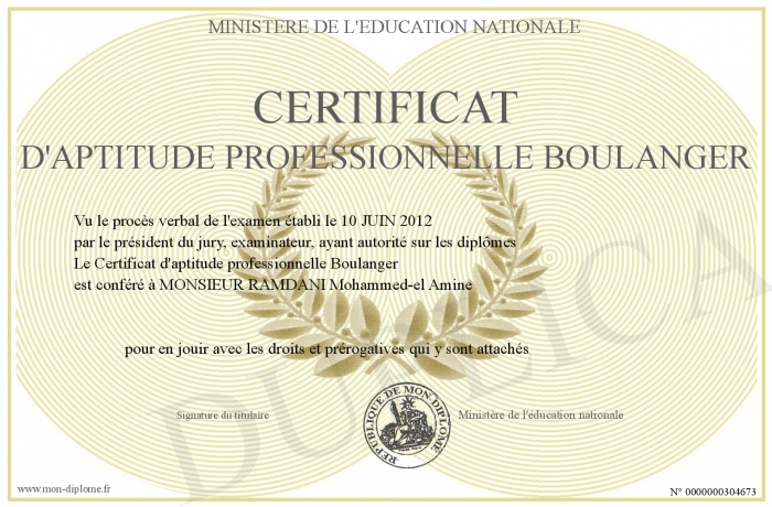 Envoyez par email votre Certificat d'aptitude professionnelle Boulanger personalisé