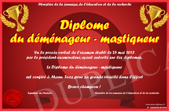 Envoyez par email votre Diplôme du déménageur - mastiqueur personalisé