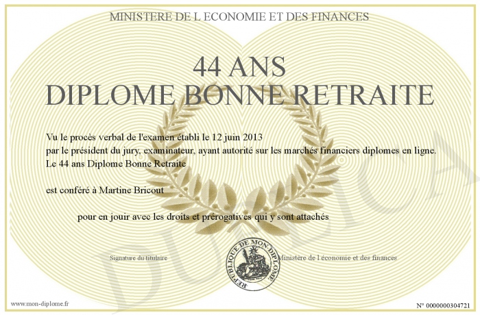 Envoyez par email votre 44 ans Diplome Bonne Retraite personalisé