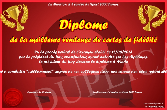 Envoyez par email votre Diplôme de la meilleure vendeuse de cartes de fidélité personalisé