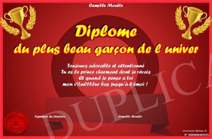 Envoyez par email votre Diplôme du plus beau garçon de l univer personalisé