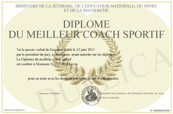 Envoyez par email votre Diplôme du meilleur coach sportif personalisé